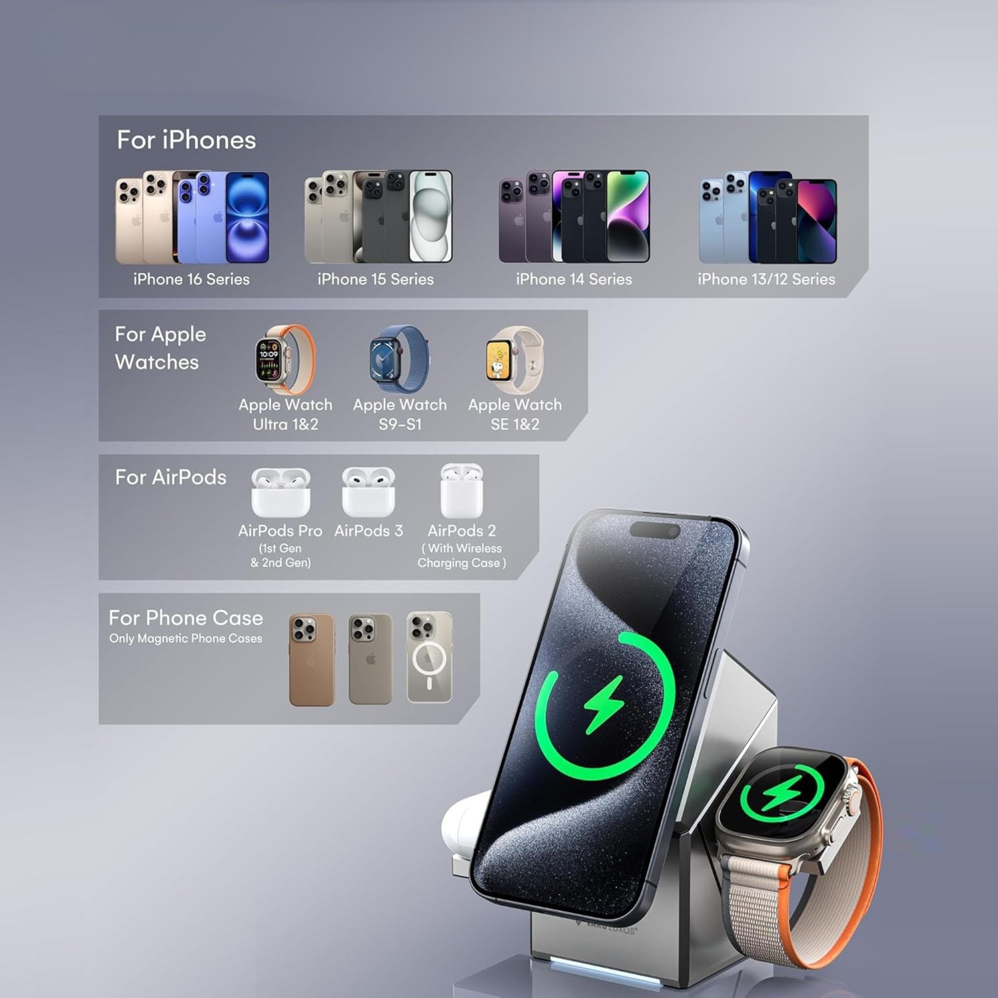 Chargeur Sans Fil Magnétique 3-en-1 MagSafe avec Support Auto-Rotatif